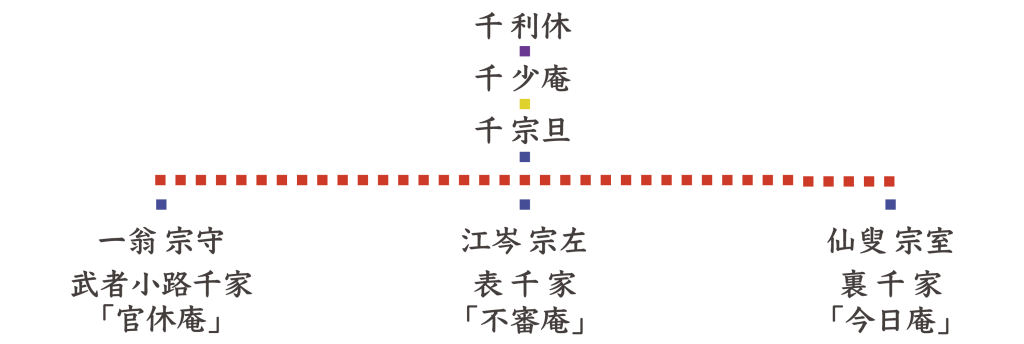 茶道の流祖は千利休であり二代目は千少庵、三代目は千宗旦である。現在では茶道流派の数は100流派以上とも500流派以上とも言われ、結局のところ解らないというところだろう。
