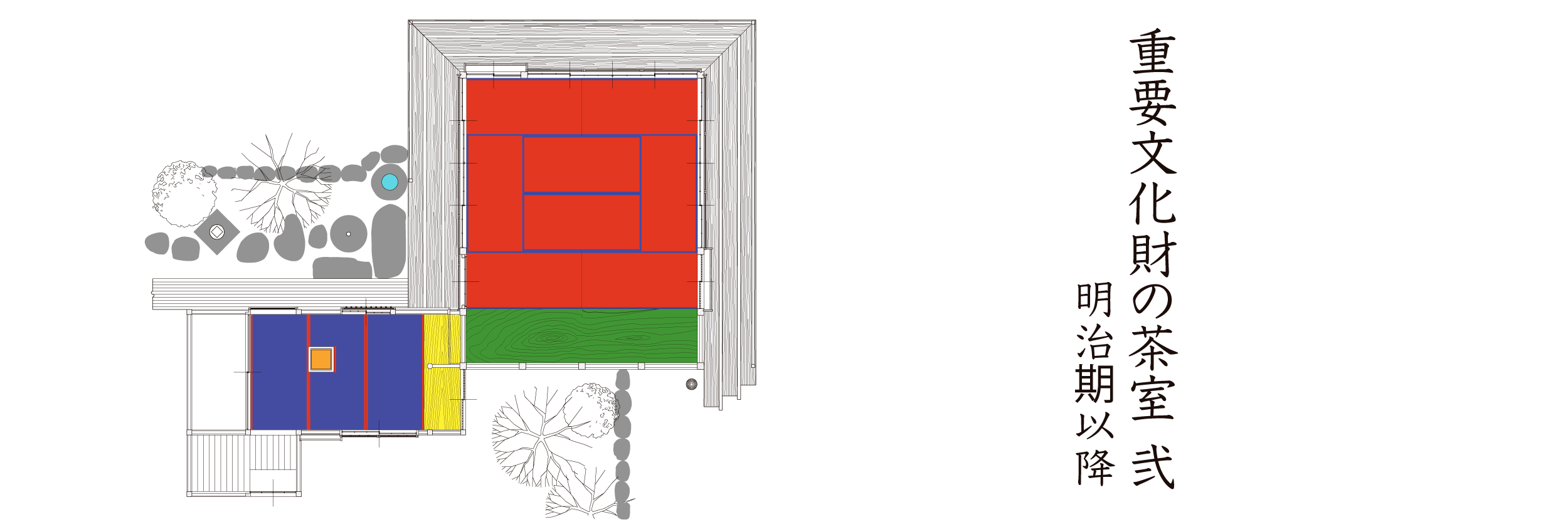 国宝の茶室は有楽苑「如庵」妙喜庵「待庵」と龍光院「密庵」この3席が広く知られ、さらに飛雲閣「憶昔席」と東求堂「同仁斎」の2席を加え5席となる。重要文化財指定の茶室は明治30年に受けた三宝院の「松月亭」を始めとして通仙院の「庭玉軒」や孤篷庵「山雲床」を加え67件100席あまりの茶室が名を連ねている。