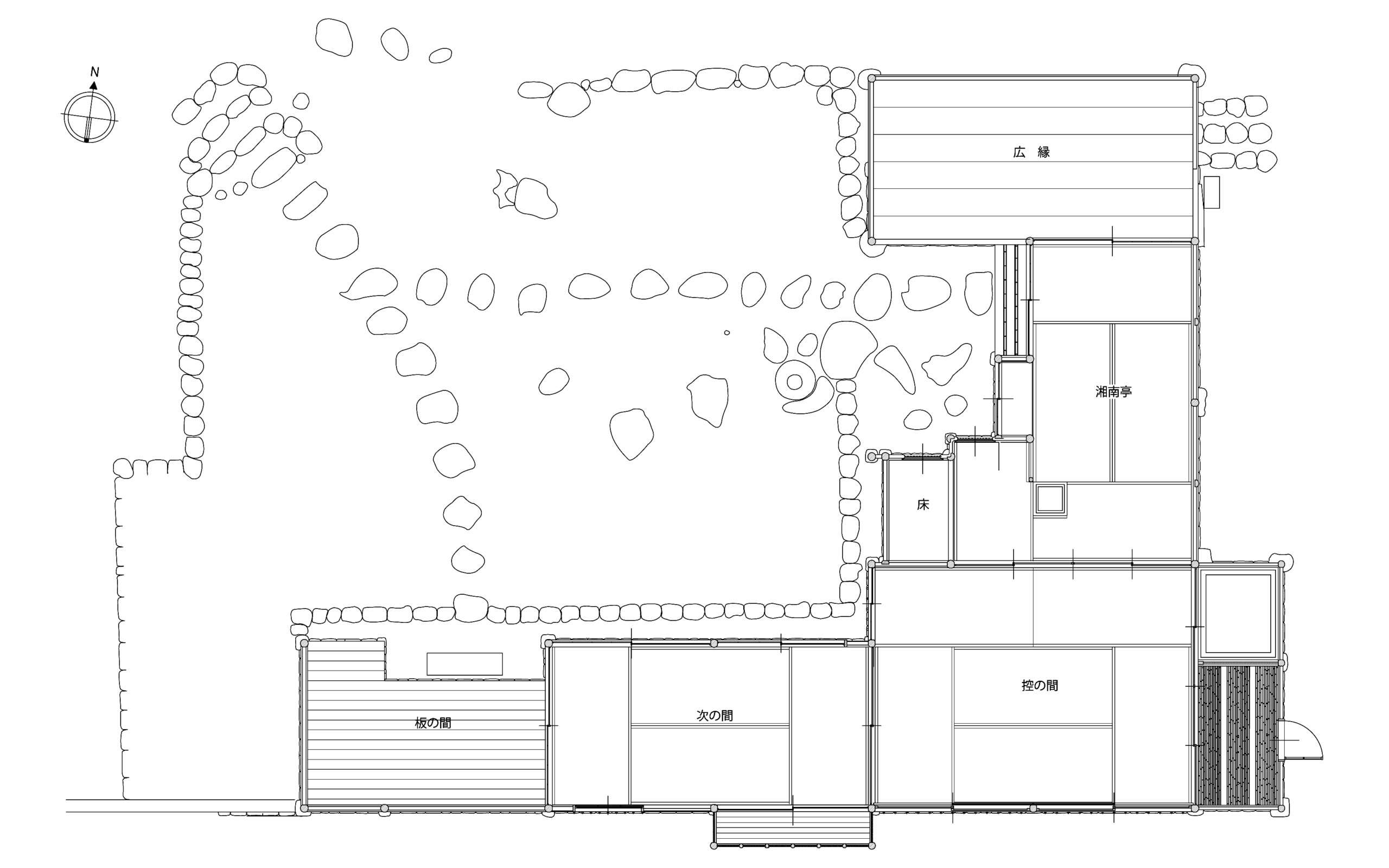 | 近世建築界では湘南亭は少庵が隠居するため再興したとされる、あるいは岩倉具視が隠棲したと伝わり、茶の湯と生活と両面の機能を備えていると評価されている。しかし私には全くこの建物に生活感を感じることが出来ない。 湘南亭の平面図には南側三室の室名は「次の間」「廊下の間」「待合」と表記される、この名称は文化庁「国指定文化財等データベース」にも「西方寺湘南亭・待合及廊下」として重要文化財に指定されており、いわゆる公式名称として捉えても良いだろう。 しかし、客をもてなすことを旨とする茶の湯の世界で裏方の空間、水屋へ客人を通すだろうか、また「廊下」として長四畳の部屋を計画するであろうか「待合」にしても一旦ここでお客を待たせる意味があろうか。 私が亭主なら見晴らしの良い広縁を待合に使用する、なにしろこの西方寺の林泉は禅庭・枯山水の完成者として世界史上最高の作庭家の一人である夢窓国師作の庭園である、季節や時間、天候により千変万化に変化する芸術的な自然の趣を庭園の中でも小高くなった地に、さらに展望台のように地面より1m20cm程高くなった広縁は当時としても素晴らしい異空間であったであろう。 この湘南亭は、その間取りから茶の湯を基とした社交場だ。もちろん湘南亭には出書院が備わり亭主が一人、徒然に思案を巡らすこともあったであろう、しかしそれを目的に計画されたものではない。あくまでも湘南亭は「懐石料理と茶の湯」で客をもてなす空間である。 もしかすと寛永年間から八坂神社の門前で栄えた祇園甲部を始めとする五花街の「仕出し料理」でもてなした茶屋文化あるいは、もともと来客時には本職の料理人が調理した仕出し料理にて客人をもてなしたとされる京都の「仕出し文化」は、この湘南亭から始まったのかもしれない。 ここで湘南亭の平面図を見てみよう、ただし今後の説明を解りやすくするため南側の室名は「次の間→控の間」「廊下の間→次の間」、「待合→板の間」としている。2間間口の建物と1間間口の建物をL字型に配置した基本計画である。北側の広縁と湘南亭は「来客用空間」として、南側の次の間、板の間は「家人用」として、それぞれの機能により明確に空間を分け、控の間が各用途別空間を繋ぐ役割を果たす配置としている。 湘南亭が社交場あるいは迎賓館として機能したであろう根拠は、主に裏方の家人用空間ある。寛永年間に始まったとされる京の仕出し料理を湘南亭の主も、この席で茶懐石として来客に振る舞ったと思われる。もし懐石料理を手前で調理するなら板の間部分は傘亭のように調理室として土間に竃を計画していたであろう。この席はあくまで「仕出し料理」を前提にしている。 各料理店の仕出料理を受け取ったのは「板の間」である、そこには受付として上り口脇に受付を設け、板の間には会席料理を入れた岡持ちを並べたことだろう、それは一料理店であったのか、茶会によっては京の中でも厳選した複数の料亭料理のみならず各地の海の幸、山の幸あるいは名産品、特産品が所狭しと並べられたのかもしれない。 「次の間」は仕出し料理を配膳する部屋であったと考えられる。南側に45cmほど張出し、竹を詰打ちした棚は食器棚と使用され長四畳の間取りの北側に器を並べ、料理を配膳するには、とても塩梅が良かったと思われる。料亭にも銘品の器があったでろうが、そこは茶匠の持物とは一味違い茶匠は、もてなす客や茶会の意味、季節によって器を吟味し現代では文化財に指定されるほどの器に料理を盛ったに違いない。 「控の間」にある大炉は計画当初より小さな炭火をいくつか並べ汁物や椀物、箸洗いなどの料理に加え湯桶を温める目的で設けた炉である、また脇の水屋は懐石で使われた多くの食器を洗うため多くの水を必要としたのであろう、水屋前には水を給する開口部が開けられている。 このように湘南亭は西方寺の林泉、懐石料理を楽しむ茶室として、誠に立地条件も抜群で建物の機能や動線も考えられた優れた建物であると共に、当時としては数寄で充実した席に招かれた客は公家や大名、高僧に違いなく、このような席を取仕切る事ができたのは、やはり茶匠、利休の二代目であった小庵だったのではなかろうか。 |