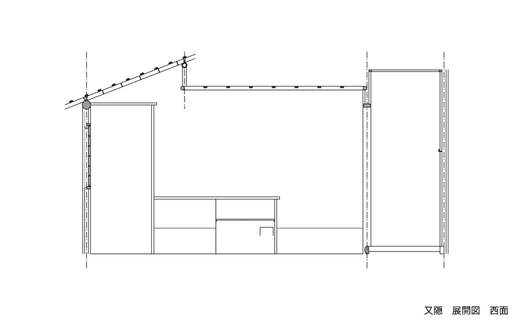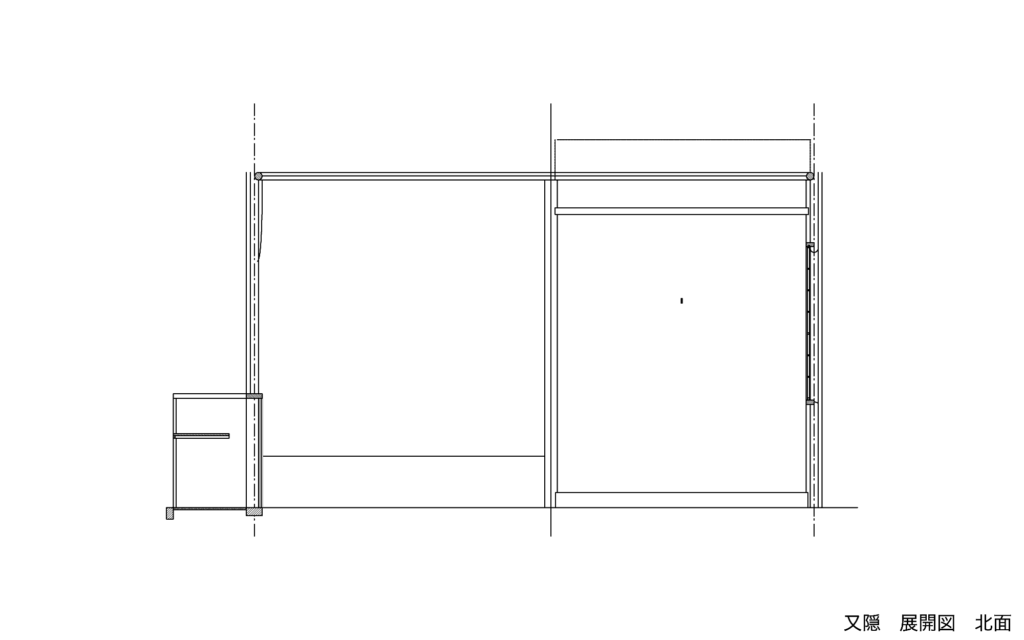 | 南側、躙口正面に畳幅四尺三寸(1303㎜)の床間を設け四畳半切の炉に洞庫が備わる。点前座の左隅は壁を塗廻し上部一尺三寸七分(415㎜)程のみ柱の丸面を見せる、いわゆる楊枝柱あるいは筆軸柱とも呼ばれ侘の趣を深めているとされる。この手法は利休二畳之茶室にて試みがなされ利休は床から鴨居まで、おおよそ二尺(606㎜)を塗廻している。利休二畳之茶室は角炉で点前座隅を塗り廻したのは防火対策として利休が考え出したのではないかと推測している。しかし宗旦は四畳半の席で、さらに侘の趣を深めるため意匠としてこの塗り廻しを取り入れ、さらに柳釘を打った。 |